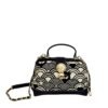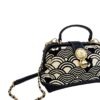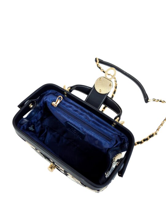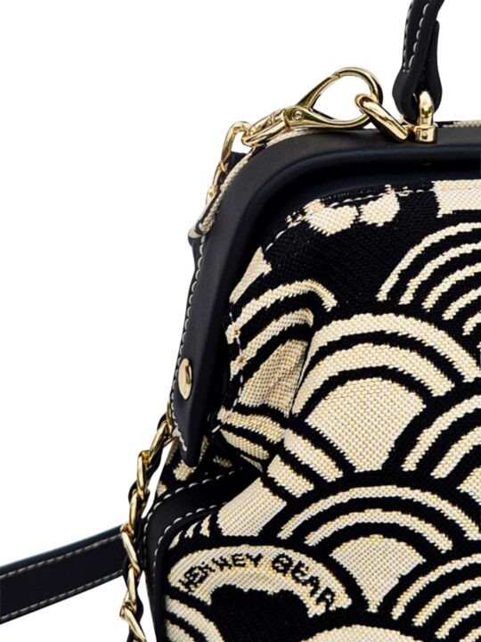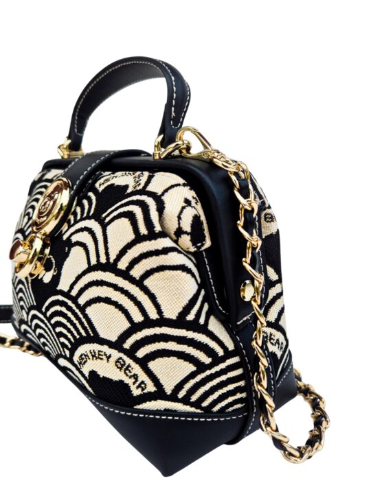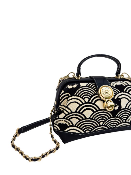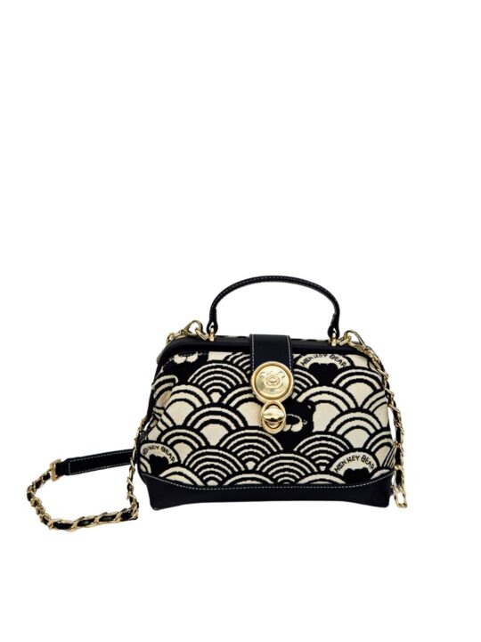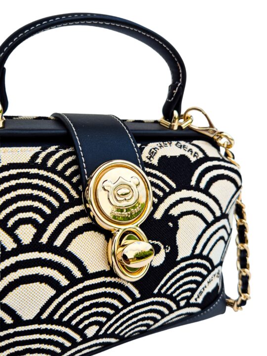 This sling abgs is a sophisticated blend of art and practicality. Designed in Henney Bear?s signature tapestry fabric with eco-conscious faux leather accents, it exudes timeless elegance. The structured hard-frame silhouette, enhanced with a signature metal lock and top handle, makes it stand out as a statement accessory. Inside, well-planned compartments keep your essentials secure, while the metal-and-leather strap offers a refined edge. Perfect for evenings out, special occasions, or a touch of everyday luxury, this sling bag is where fashion meets function with Henney Bear?s signature charm.