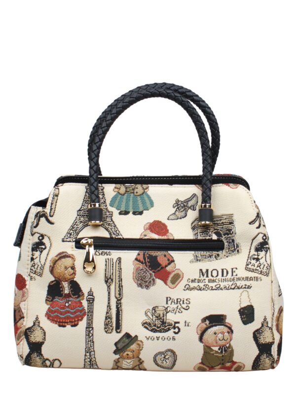 This bag blends sophistication with everyday practicality. Designed in Henney Bear?s signature tapestry fabric and accented with faux leather trims, it embodies vintage charm with a modern edge. Its compact silhouette makes it perfect for daily outings or special occasions, while the top handle and detachable strap offer versatile styling options. With well-structured compartments inside, it ensures your essentials remain organized without compromising on elegance. Protective metal feet add durability, making this bag a chic yet functional companion for the modern woman.