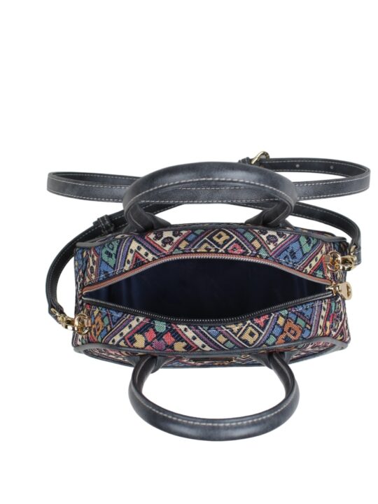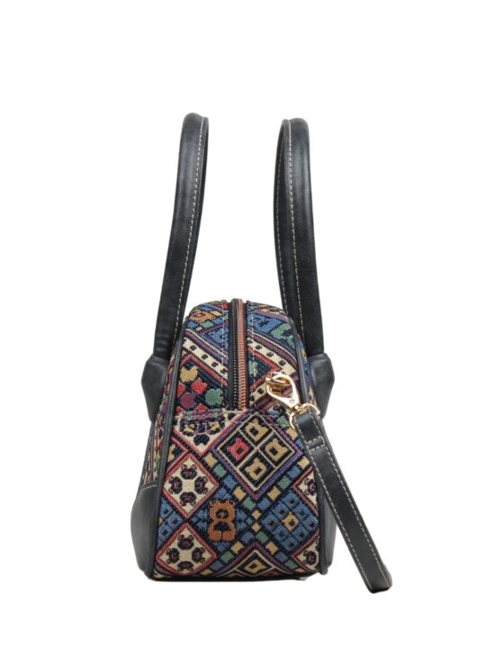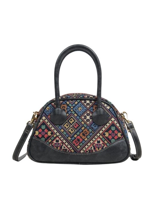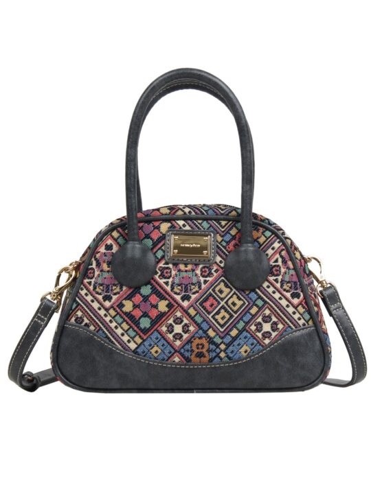 This bag blends sophistication with everyday practicality. Designed in Henney Bear?s signature tapestry fabric and accented with faux leather trims, it embodies vintage charm with a modern edge. Its compact silhouette makes it perfect for daily outings or special occasions, while the top handle and detachable strap offer versatile styling options. With well-structured compartments inside, it ensures your essentials remain organized without compromising on elegance. Protective metal feet add durability, making this bag a chic yet functional companion for the modern woman.